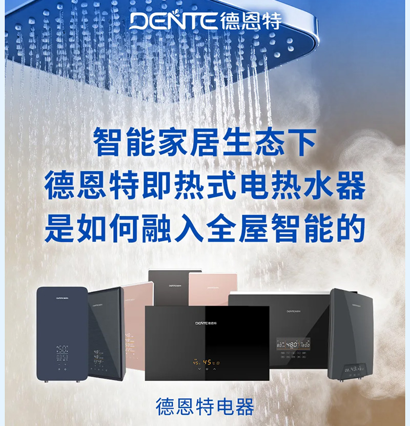 当智能家居从概念走向普及,作为家庭高频使用的核心设备,电热水器已不仅是热水供应源,更是全屋智能生态的重要一环。德恩特,作为快热式电热水器国家标准起草单位,凭借全维度的智能设计,让热水器真正成为懂你的智慧伙伴。