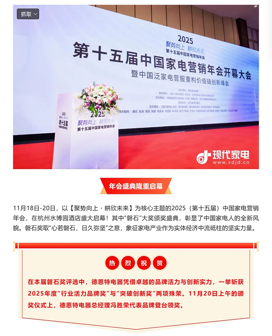 德恩特电器喜获2025年度中国家电行业磐石奖两大奖项